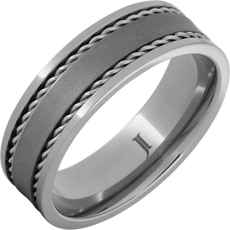 High tech commercially pure titanium delivers an industrial look, with two rope braided steel wire inserts and a satin center finish. Available in both men's and women's sizes, with inside rounded Comfort Fit.