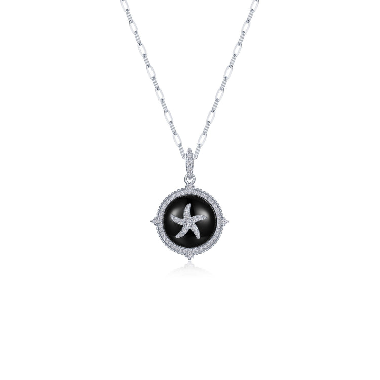 A captivating tribute to the ocean’s mystery, this pendant features a finely detailed starfish symbolizing renewal, guidance, and endless possibilities. Set against a striking black onyx backdrop and adorned with sparkling Lassaire simulated diamonds in sterling silver bonded with platinum.
